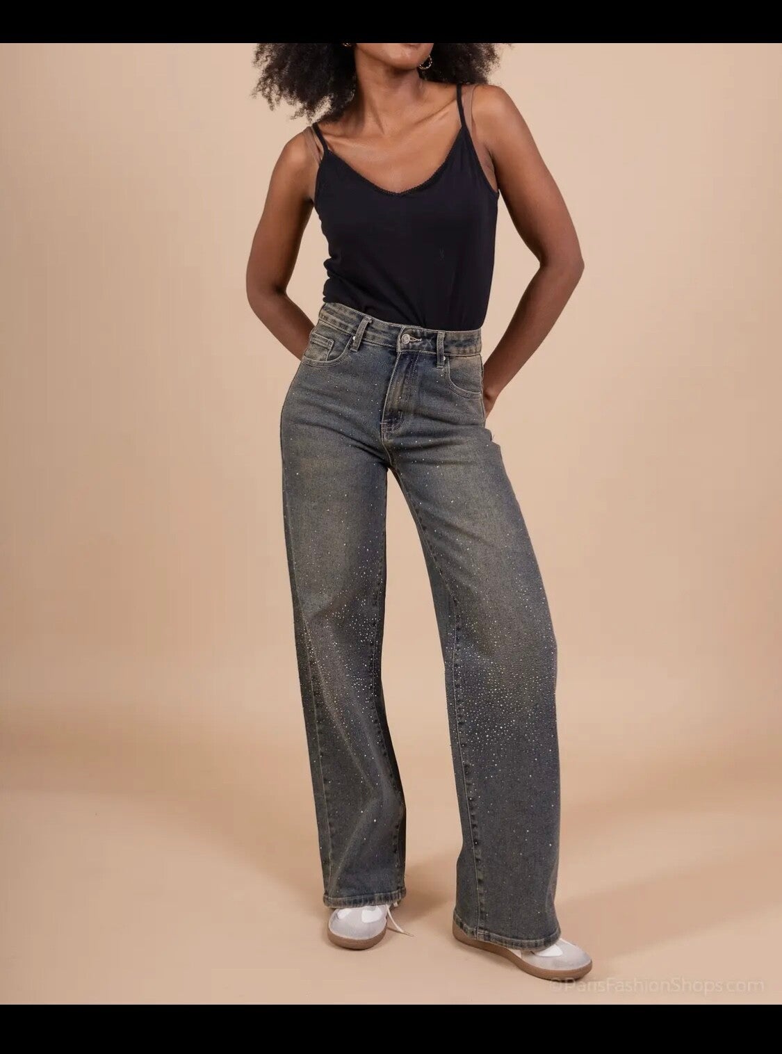 Knappe jeans wide leg met strass vooraan.