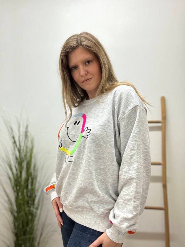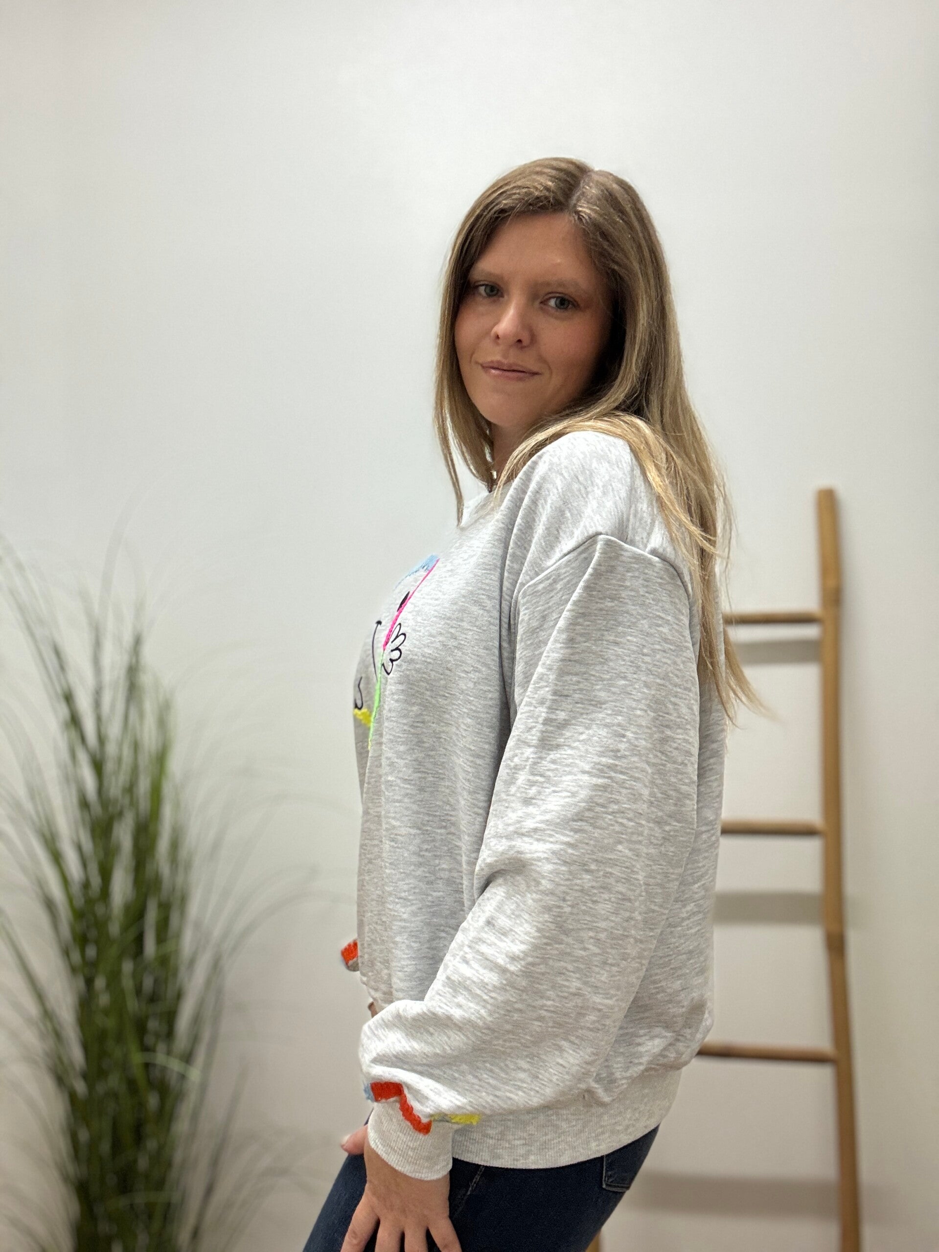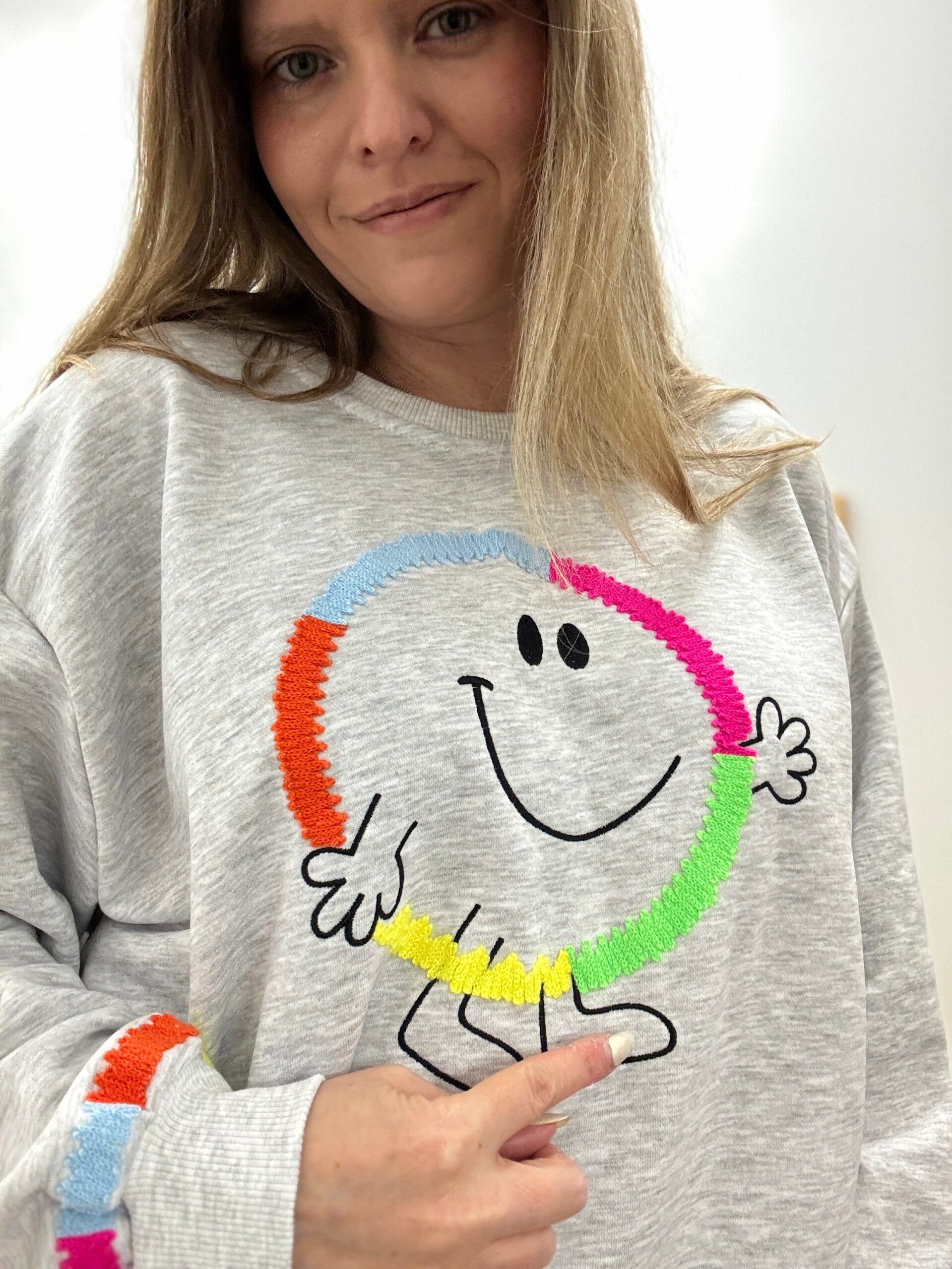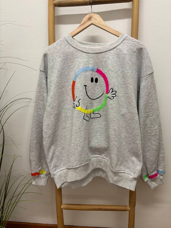 Deze one size grijze sweater combineert comfort met karakter dankzij de speelse smiley op de voorkant.