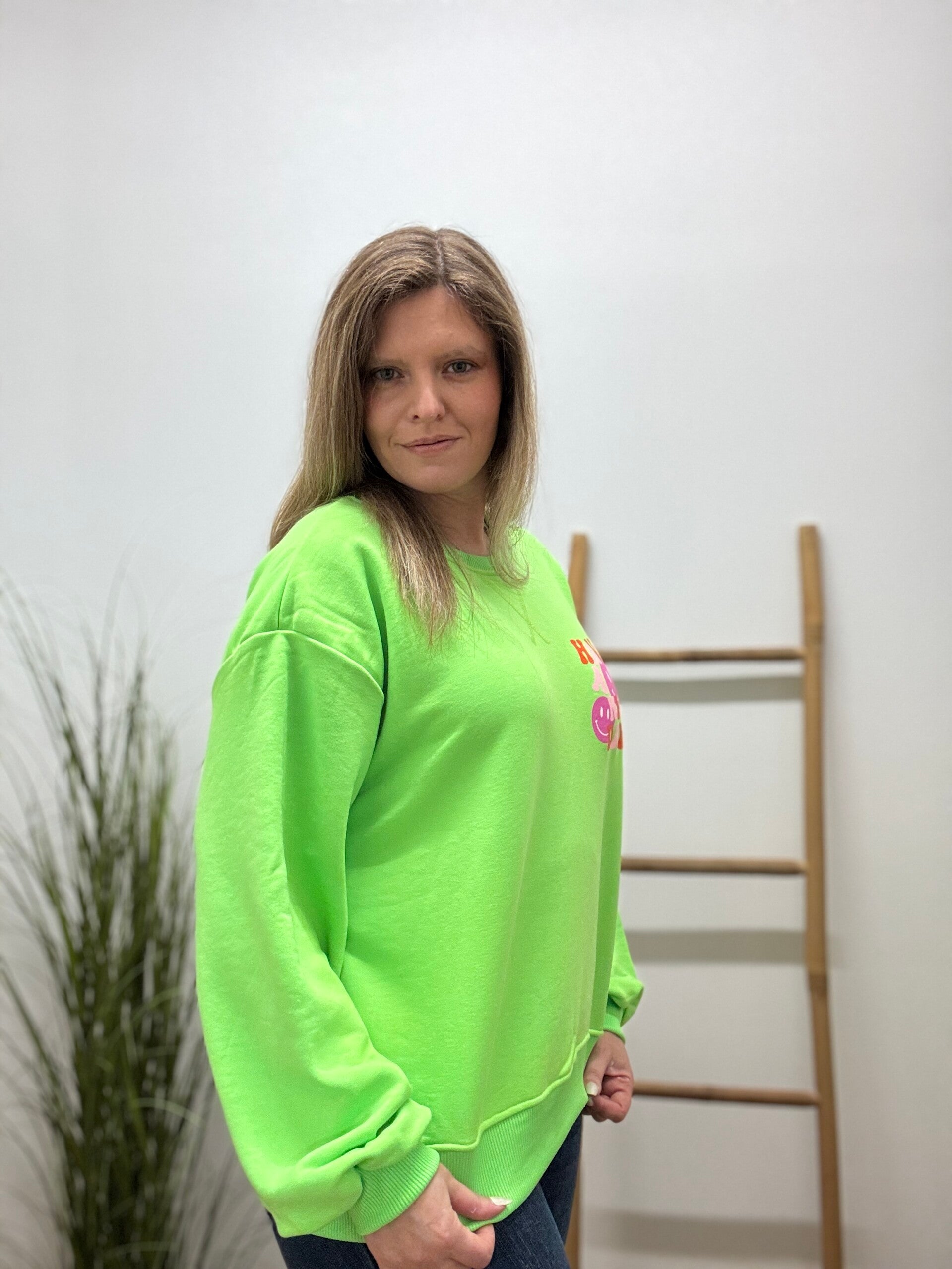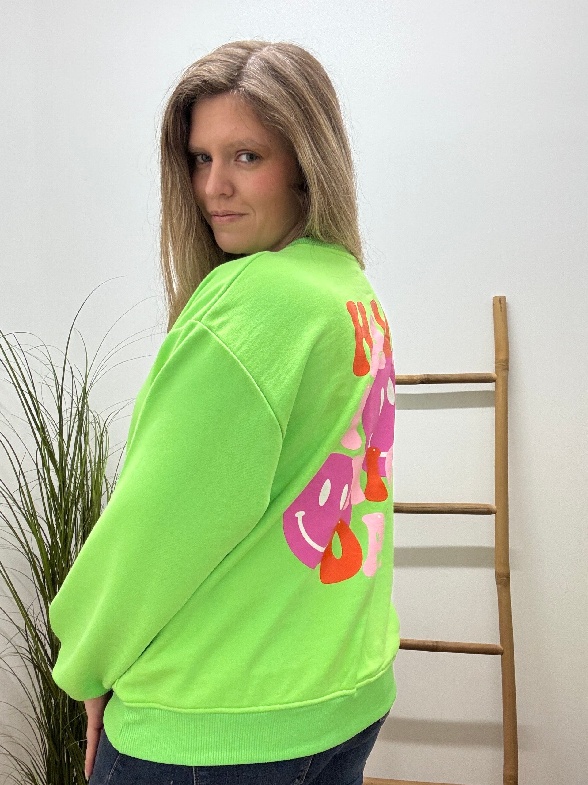 Deze fluogroene sweater voor dames in one size is een echte eyecatcher, afgewerkt met een coole print die je outfit meteen power geeft. Comfortabel, trendy en perfect voor elke dag.