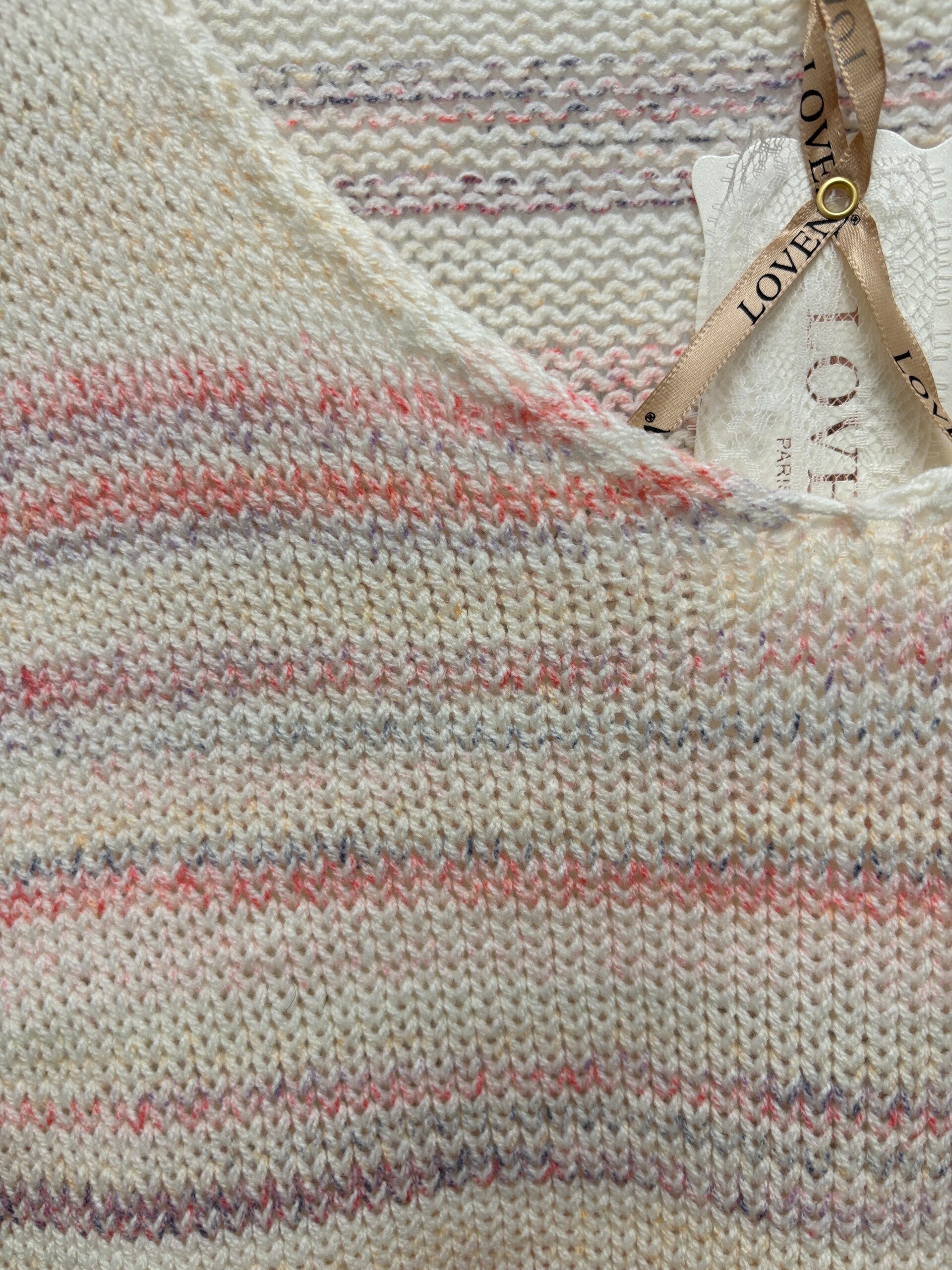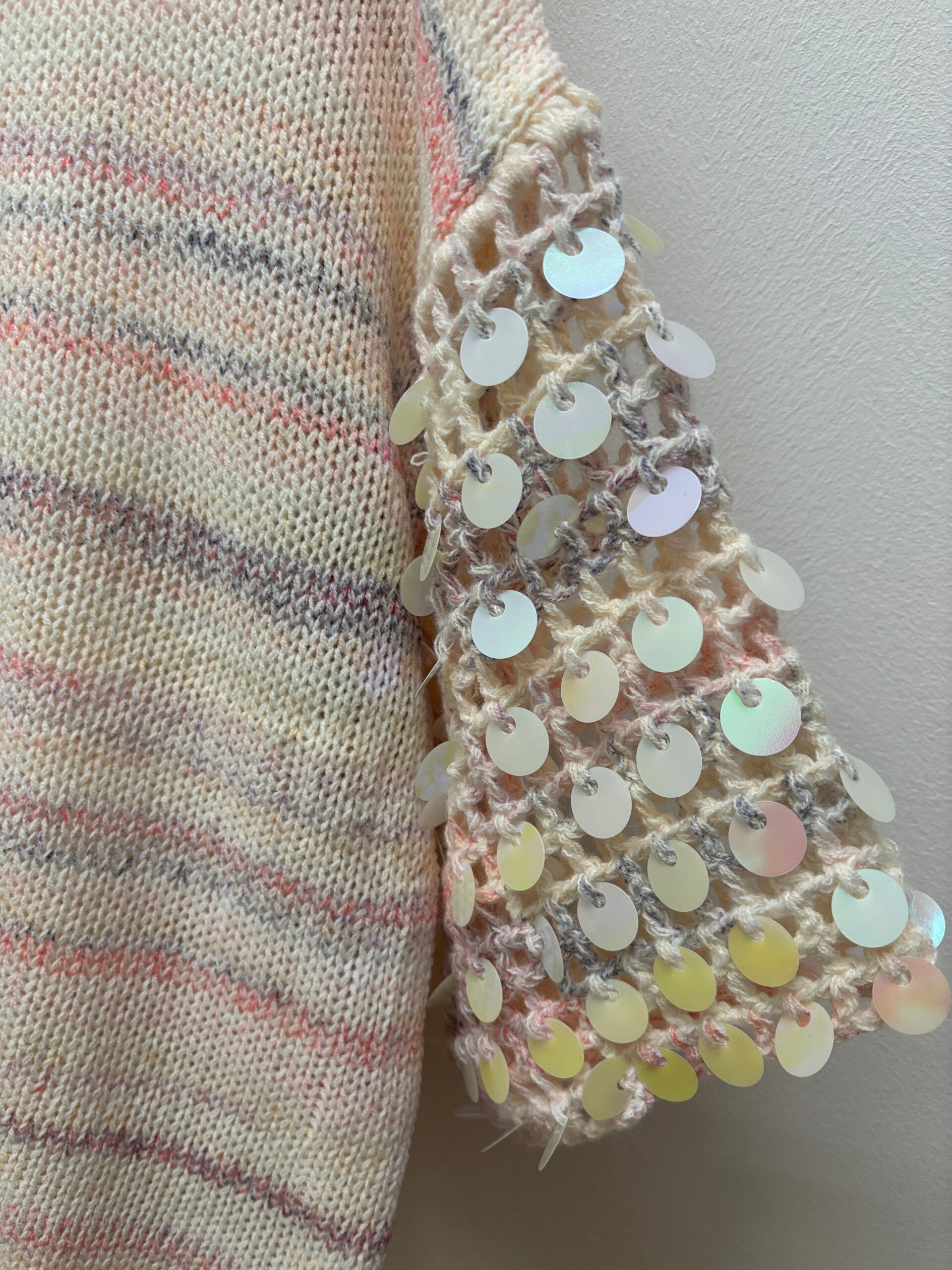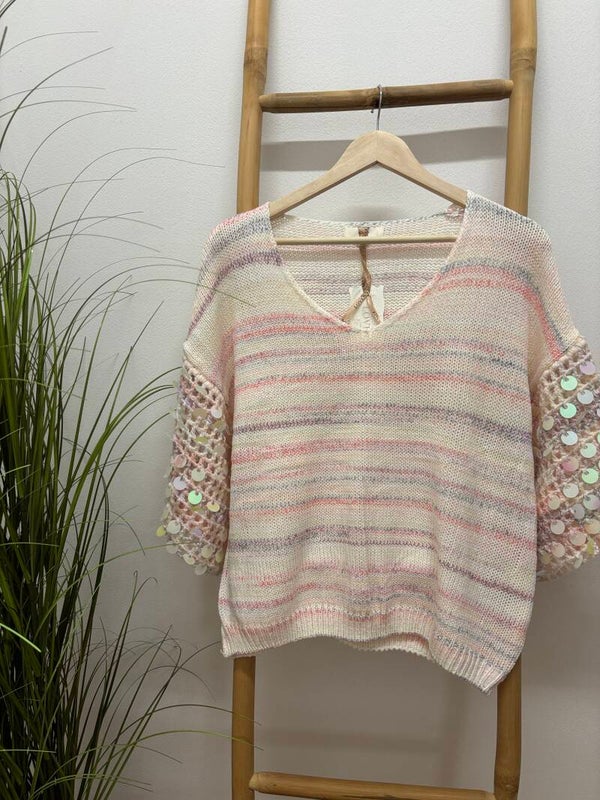 Deze gestreepte knit in boheemse stijl krijgt een glam upgrade dankzij de pailletten op de mouwen.