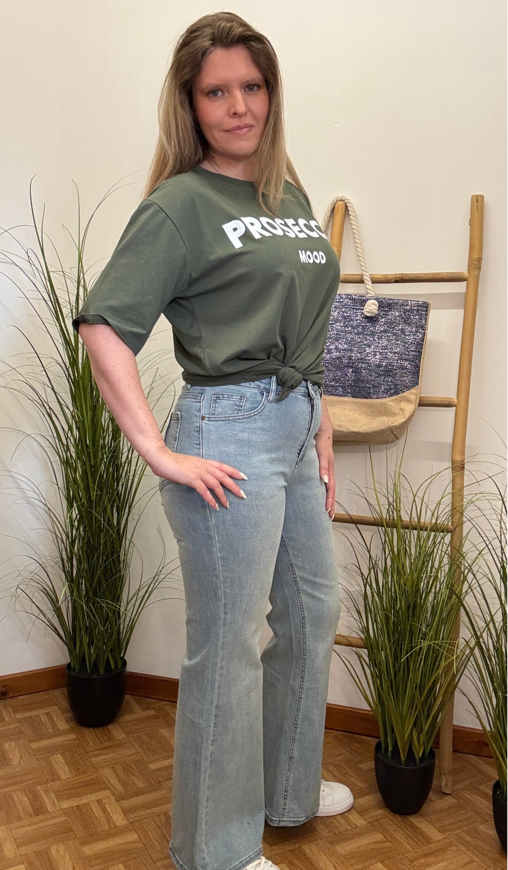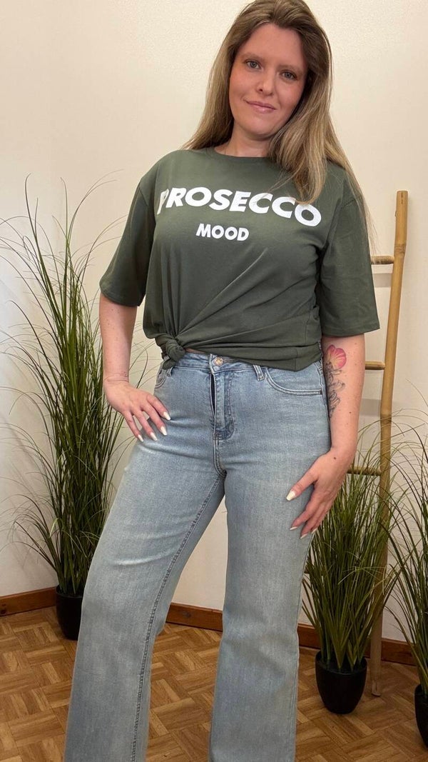 Dit kaki dames T-shirt met speelse “Prosecco Mood” print brengt instant fun in je outfit.