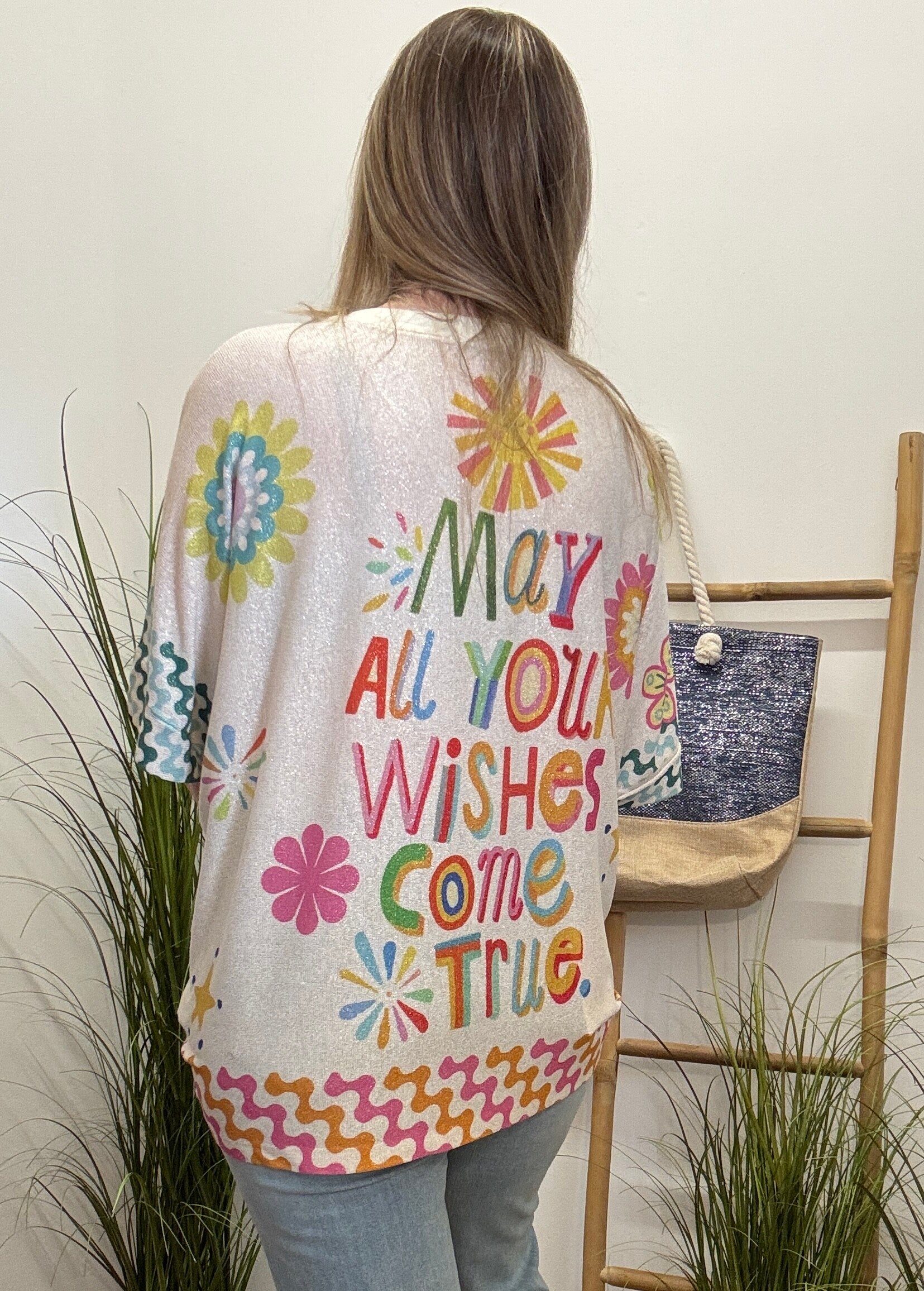 Vooraan hou je het relaxed en cool, maar het echte statement zit achteraan: “may all your wishes come true” – een boodschap die even zacht binnenkomt als jouw stijl sterk is.