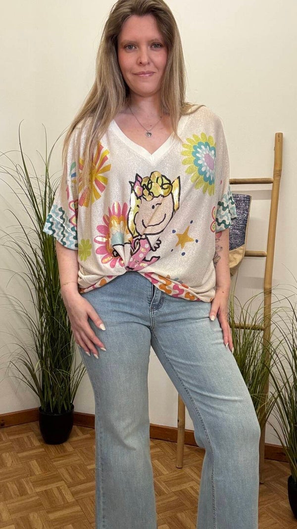 Perfect om te combineren met je favoriete jeans, shorts of een edgy broek – dit T-shirt geeft elke outfit een unieke mix van fun, shine en attitude.