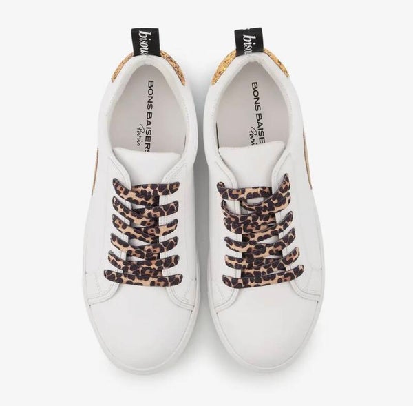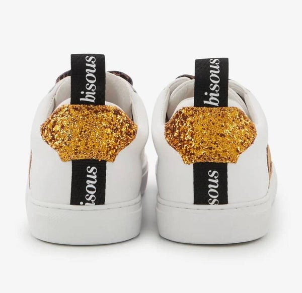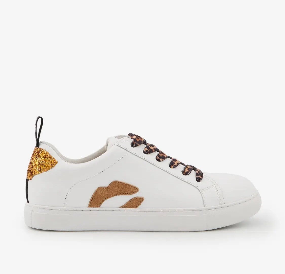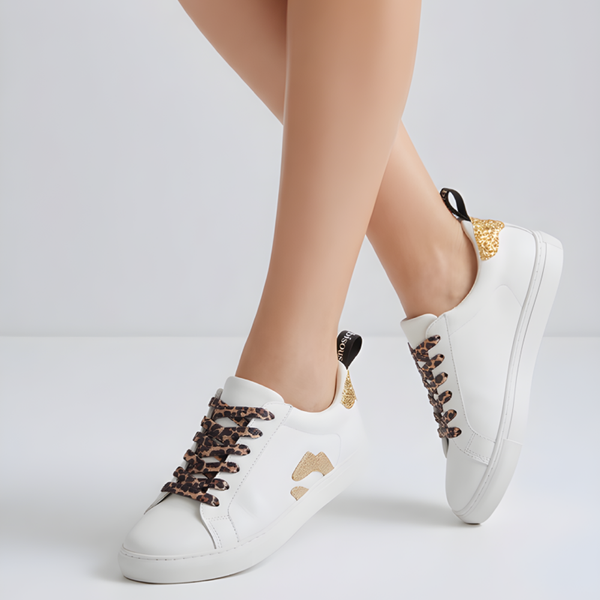 Wat deze sneakers echt bijzonder maakt, zijn de gedurfde details: opvallende leopard veters die een speelse, edgy touch geven en een sprankelende glitterafwerking aan de achterzijde die elke stap laat schitteren.