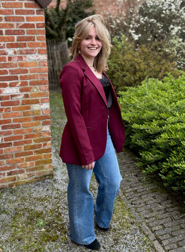 Ervaar pure klasse met deze bordeauxrode blazer, waar Italiaans vakmanschap en moeiteloze elegantie samenkomen.
