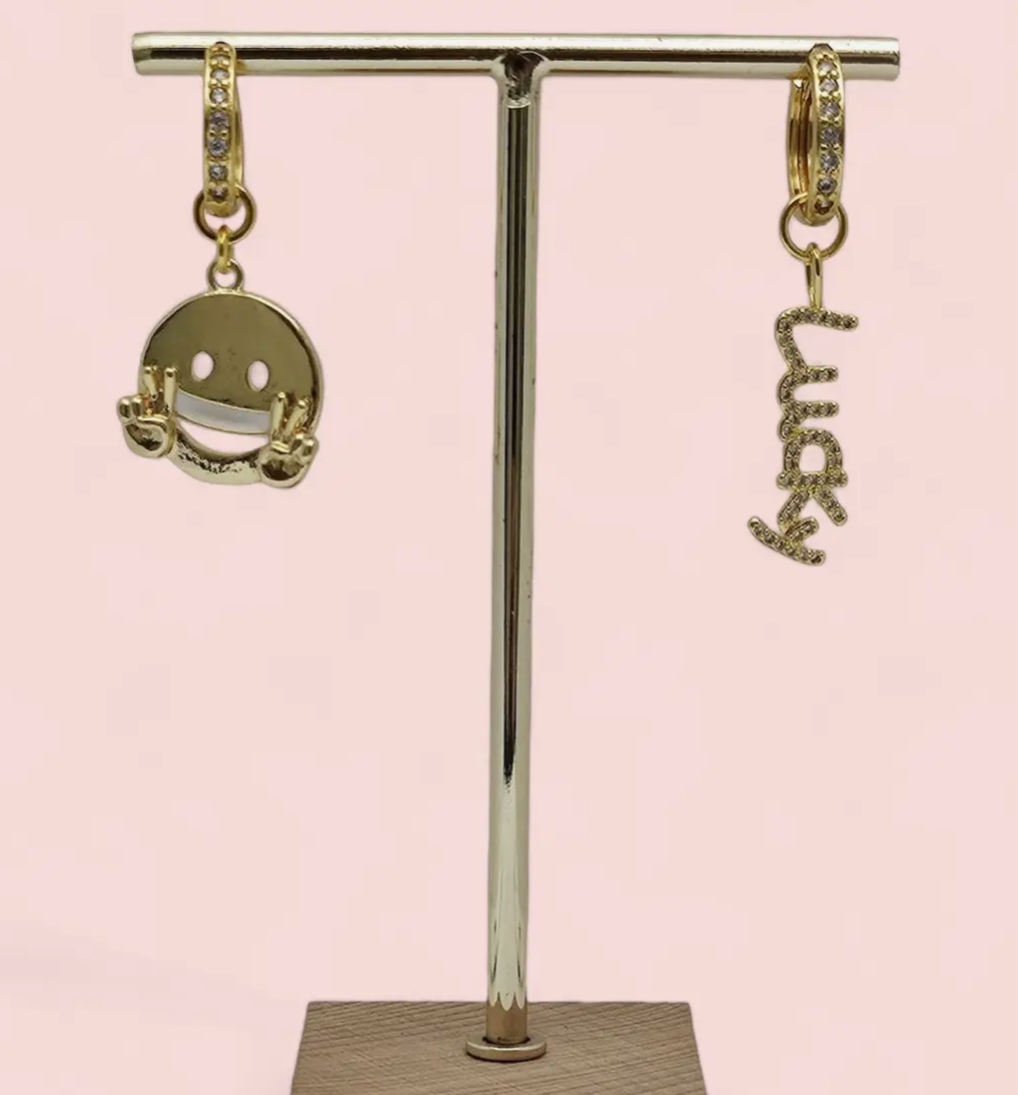 De ene oorbel straalt met een vrolijke smiley, terwijl de andere oorbel het woord “lucky”, gevuld met fonkelende zirkonen, laat schitteren. Samen vormen ze een speels en krachtig statement: kies voor geluk, elke dag.